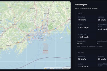 Suomalainen Reddit-käyttäjä on tehnyt verkkopalvelun, joka näyttää reaaliajassa ylinopeutta ajavat HSL:n linja-autot. Tiedot pohjautuvat reaaliaikaiseen avoimeen dataan, eli HSL:n GTFS-reaaliaikadataan ... Lue lisää...