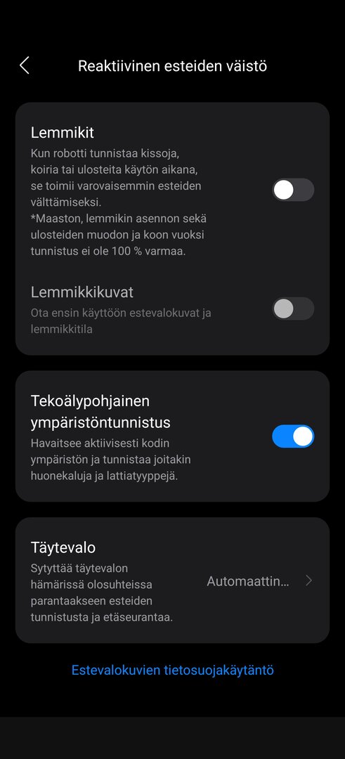 Roborockin parempien robottien esteiden väistely on mielestäni parantunut vuosi vuodelta, aina uusien mallien ja ohjelmistopäivitysten myötä. Roborock Saros Z70:n osalta esteiden tunnistus kameralla - ja niiden väistely - alkoi olemaan jo varsin hyvällä tolalla.