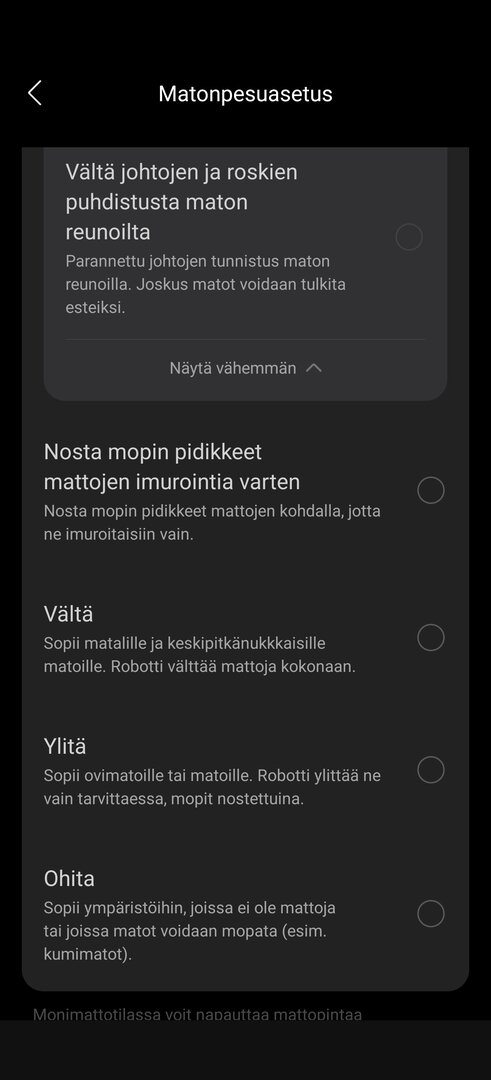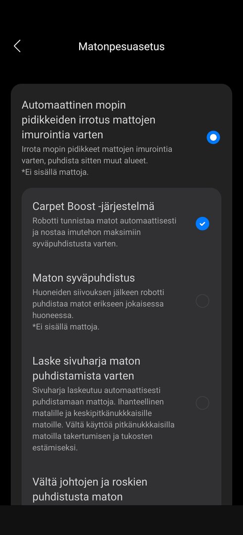 Mattoja robo ei mopillaan kastele, vaan se osaa nostaa noppilevyään mattojen kohdalle osuttuaan - tai vaihtoehtoisesti asetuksista voi ohjelmoida robon jättämään kokonaan moppilevyt pois silloin, kun sen olisi tarkoitus imuroida mattoja.