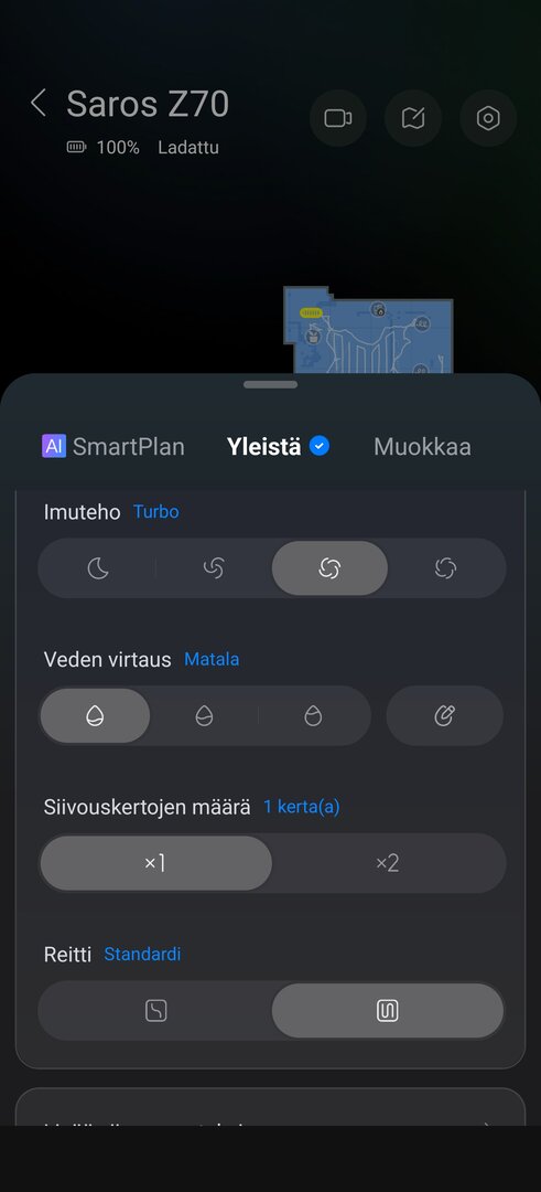 Roborockin älypuhelinsovellus on sama kaikille Roborockin tuotteille - ja täsmälleen samanlainen sekä iPhonella että Androidilla. Sovellus suomennettiin hiljattain, joten yksi iso Roborockin menestystä kotimaassamme jarruttanut tekijä on vihdoin korjattu kuntoon sekin.