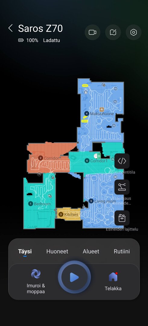 Todettakoon kuitenkin samaan hengenvetoon, että jos Roborockia vertaa "tavallisiin" robotti-imureihin, niin Saros Z70:n uskaltaa päästää siivoamaan asuntoa, vaikka lattia olisi täynnä lasten leluja, vaatteita ja vaikkapa latureiden johtoja. Se jumittaa johonkin esteistä ehkä noin joka kymmenes siivouskerta, mutta pääsääntöisesti sen esteiden väistelyyn voi luottaa - eikä lattioita tarvitse raivata tyhjäksi ennen siivousta.