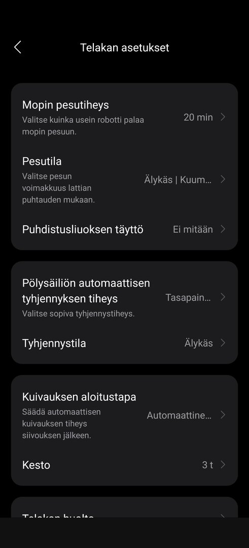Ärsyttävintä on mopin kuivauksen hurina. Vaikka ääni on todella hiljainen, se on sen verran pitkäkestoista, että en suosittele robotin telakan sijoittamista olohuoneeseen tai makuuhuoneeseen, jossa se voisi häiritä television katselua tai nukkumista.