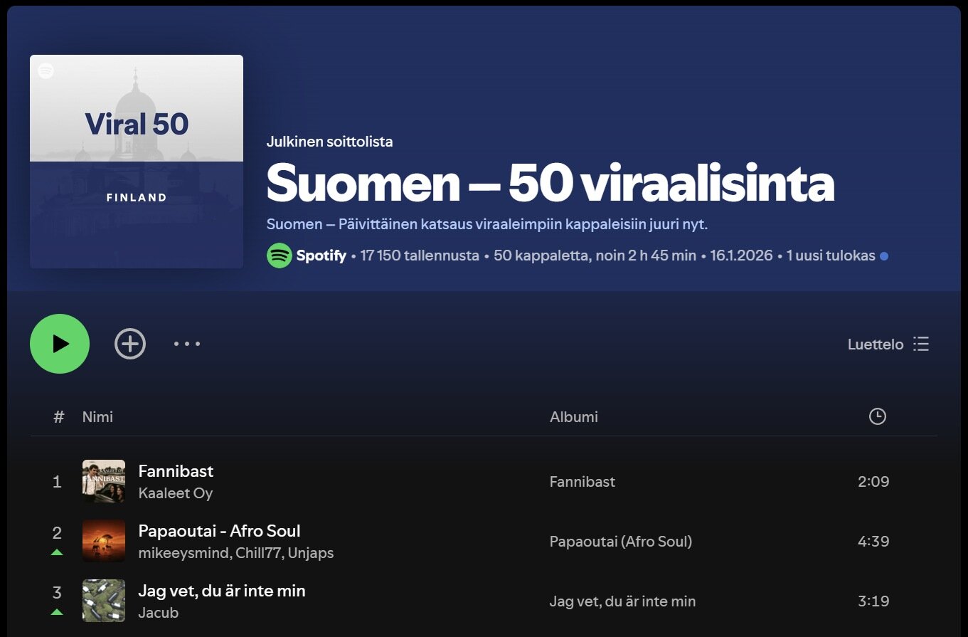 Kävimme listan kärkikolmikon 16.1.2026 ja selvitimme artistien taustoja. Ykkösenä oleva Kaaleet Oy vaikuttaa BBC:n luoman tekoälymusiikin tarkastuslistan pohjalta lähes varmuudella tekoälyllä luodulta "yhtyeeltä".
