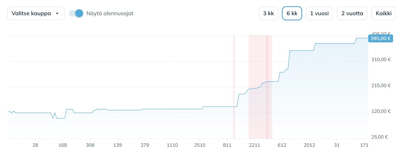 Vieläkin hurjempia heittoja nähdään Kingstonin yksittäisen 64 gigatavun DDR5-muistin osalta. Kyseinen muisti maksoi kesällä pitkään 199 euroa. Syksyllä hinta nousi maltillisesti noin 230 euron tasolle.