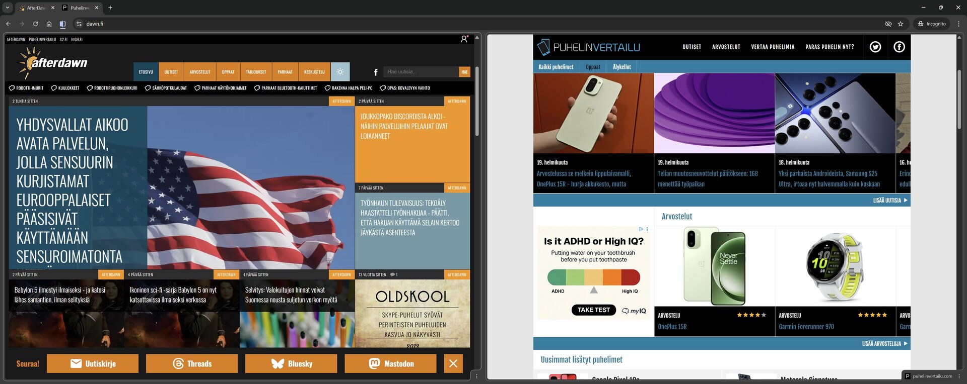 Toimintoon pääsee käsiksi klikkaamalla oikeaa hiirennäppäintä haluamansa välilehden päällä ja valitsemalla siitä split view eli jaetun näkymän. Valinnan jälkeen pitää vielä valita, mikä välilehdistä avataan valitun välilehden viereen.